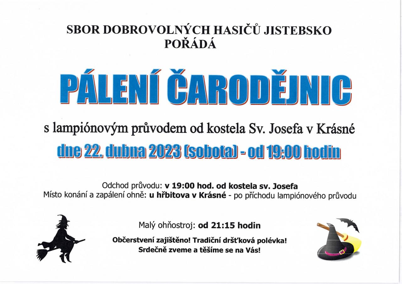 Sbor dobrovolných hasičů Jistebsko pořádá lampionový průvod s pálením čarodějnic na Krásné dne 22.4.2023